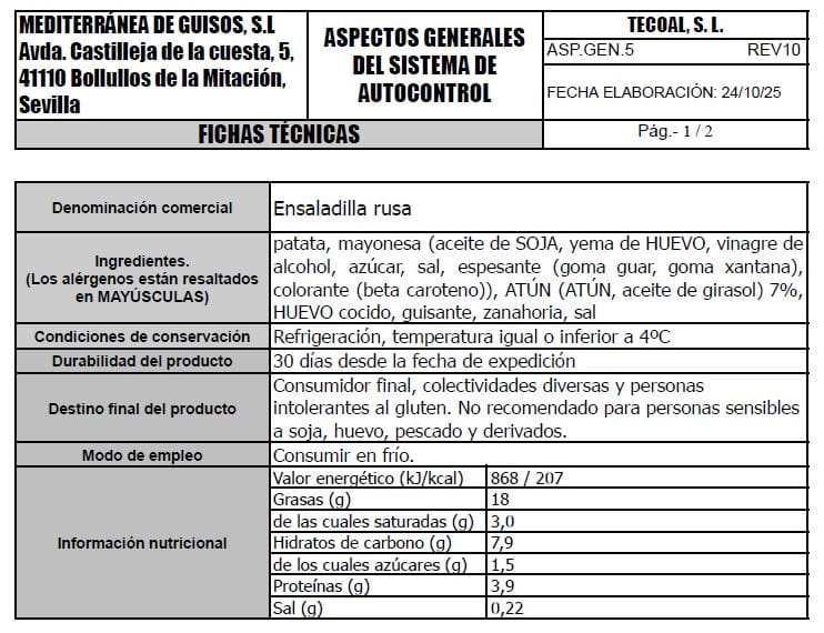 patata 39%, mayonesa (SOJA, HUEVO) 24%, agua de cocción 14%, ATÚN (ATÚN, aceite de girasol) 7%, HUEVO cocido 7%, guisante 5%, zanahoria 5%, sal 0,13%