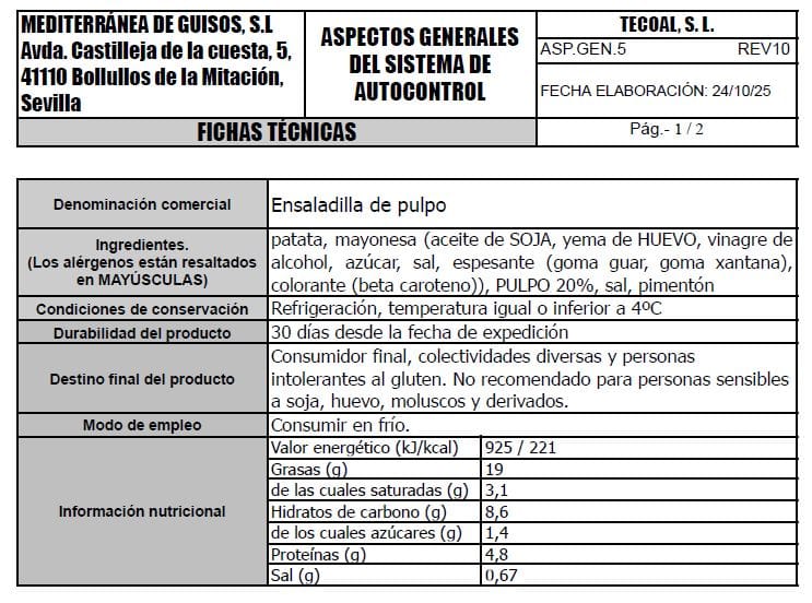 patata 53%, mayonesa (SOJA, HUEVO) 27%, PULPO 20%, sal 0,5%, pimentón 0,2%, pimentón 0,2%.