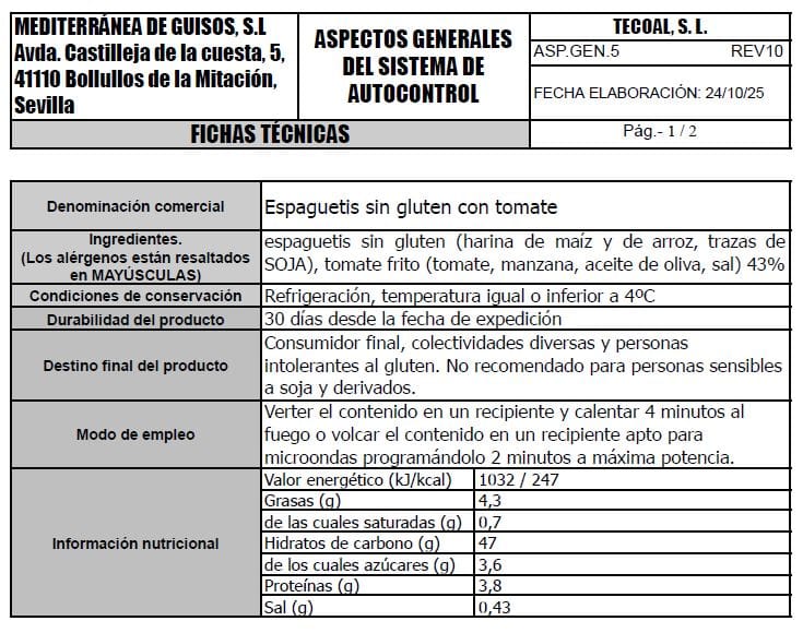 espaguetis sin gluten (SOJA) 57%, tomate frito (tomate, manzana, aceite de oliva, sal) 43%.
