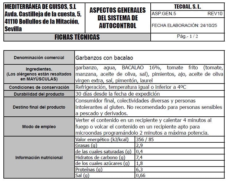 garbanzo 45%, agua 24%, BACALAO 16%, tomate frito (tomate, manzana, aceite de oliva, sal) 6%, pimientos 6%, ajo 2%, aceite de oliva virgen extra 0,82%, sal 0,33%, pimentón 0,08%, laurel 0,01%.