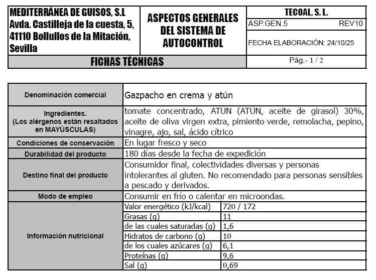 tomate concentrado 35%, ATÚN (ATÚN, aceite de girasol) 23%, HUEVO cocido 22%, aceite de oliva virgen extra 5%, pimiento verde 5%, pepino 3%, remolacha 3%, vinagre 0,70%, sal 0,54%, ajo 0,54%, 0,08%